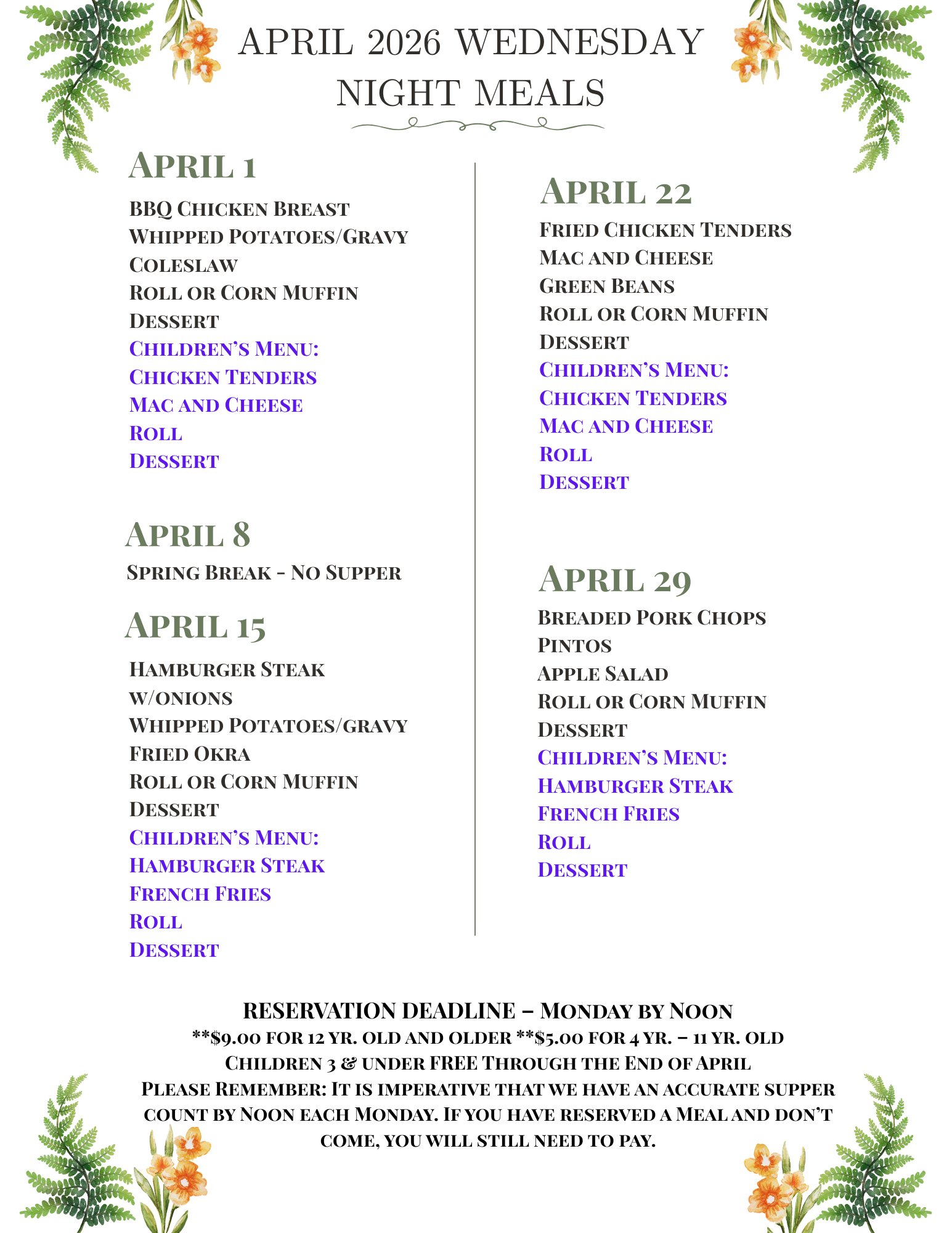 5:30pm | Family Night Supper by reservation only. Call 864-582-7467 or email office@fernwoodchurch.org